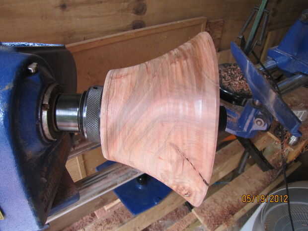 Antes de empezar a girar el interior, asegúrese de que el recipiente no está fuera del centro. Busque grietas obvias o agujeros de cualquier tipo. Cuidado con corteza, demasiado, porque puede volar y le golpeó. Asegúrese de que el recipiente esté montado a un mandril y que el plato esté montado en el torno. Te recomiendo perforar un agujero en el centro que es de alrededor de 3/8 de una pulgada o tan. Si se corta demasiado cerca para el centro y la gubia se mueve a la mitad del tazón de fuente que se mueve, la gubia se recogerán, lanzado alrededor y hacia abajo en el soporte de la herramienta con mucha fuerza. Taladrar un agujero puede ayudar a prevenir.