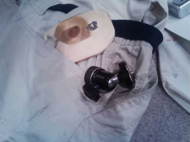 La base es un trípode de una cámara de seguridad que se atornilla en una tuerca en T de madera. Esta madera es esculpida (Tabla VI y lijadora de la correa) para envolver cómodamente alrededor de los posteriores.