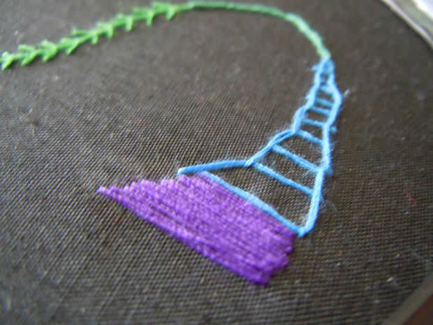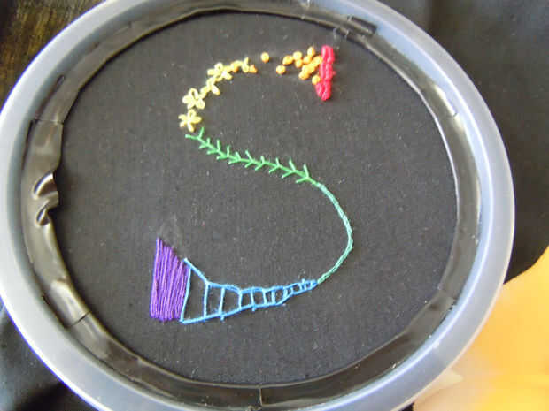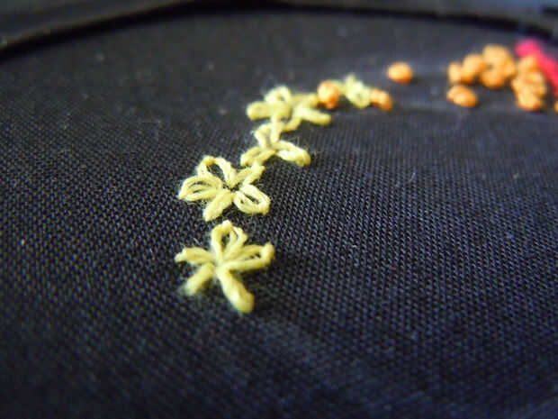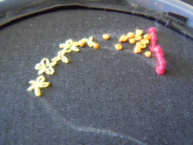 En orden, he usado rodillo puntada, nudos franceses, perezosos margaritas, mosca la puntada, puntada de cadena, doble manta y finalmente satinado.