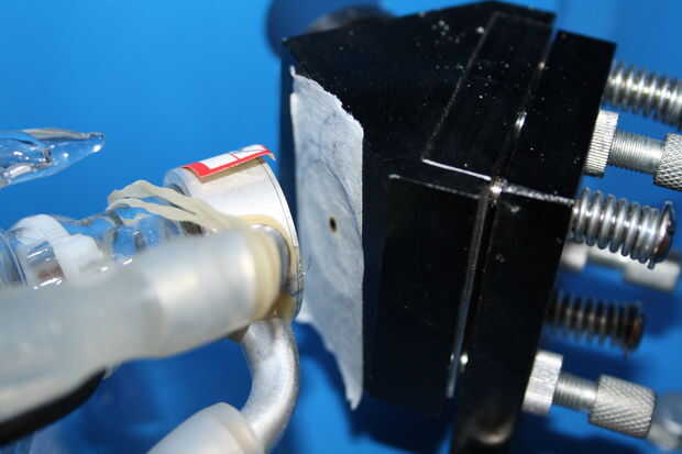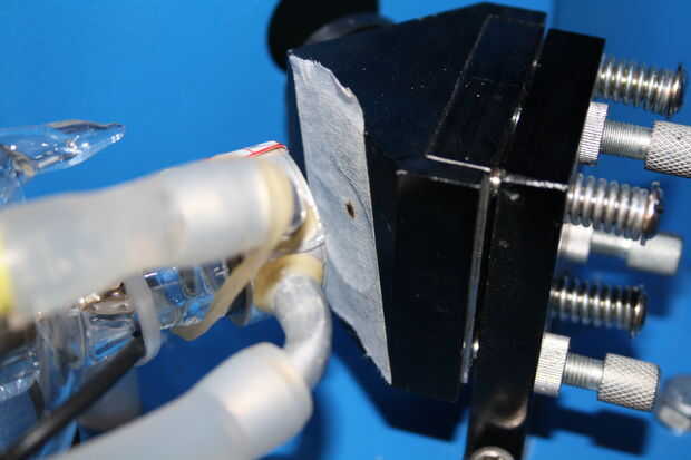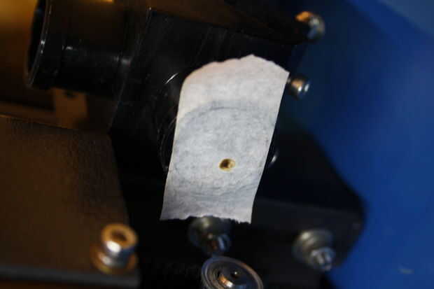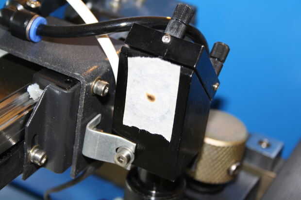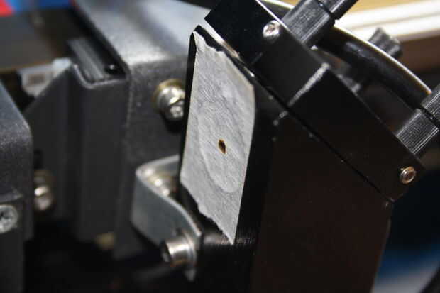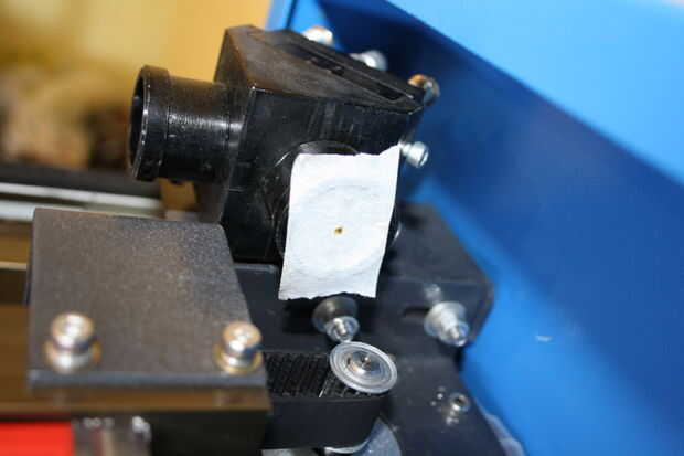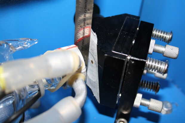 Paso 12 | El tercer espejo había regulada el rayo entra en la lente. Asegúrese de que no hay ninguna cinta adhesiva cubriendo cualquier espejos. Coloque el cabezal de corte a la altura correcta sobre la superficie de corte y el láser de pulso. Si el espejo está alineado correctamente debe ser un pequeño punto negro. Si no se coloca derecha puede ver un punto más amplio con lo que parece un arco. El arco es el resultado de destello de lente. Ajuste el espejo será solucionar el problema.