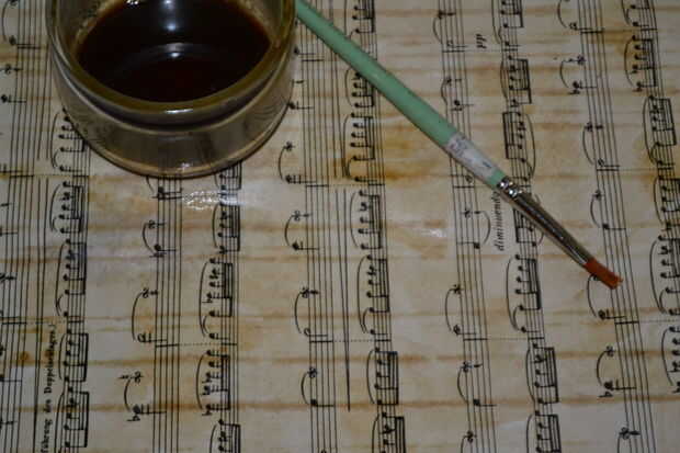 Pintura de la página de música cuenta con café para darle un toque envejecido.