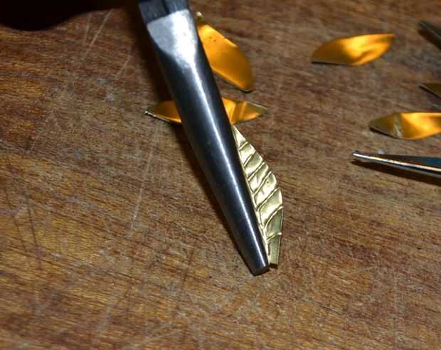 Cortar muchas hojas pequeñas formas en el aluminio. Haga una línea en el medio y muchos en los lados de la misma, con algo puntiagudo (yo usé las tijeras). Doblarlas un poco por la mitad con los alicates.