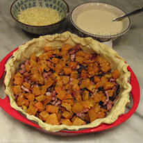 4. ahora, ponga asado refrigerado por pedazos de calabaza en la parte superior,... esta es tu 2ª capa. En un bol romper 2 huevos. Batir con un tenedor. Vierta la soya crema en ella. Batir todo junto. Añadir algún condimento. Mezclar con un tenedor. Vierta esta mezcla de crema y huevo todo las capas de calabaza-verduras-tocino, todo uniformemente divididas. Se trata de la capa 3.