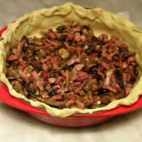 3. 15 minutos antes de que usted va a utilizar su masa, llevarlo fuera de la nevera y en el paquete. Dejar al resto en marcha. Precaliente su horno nuevamente por 5 minutos o así. Tomar la lata de hierro fundido y aceite. Ponga papel para hornear en el mismo, perfectamente. Ahora, con las 2 manos, poner la masa sobre el papel de la hornada y colóquelo cuidadosamente en el fondo y lados de la lata. Hacer esto con ayuda de sus manos y dedos. Veo que no hay ningún agujero, de lo contrario cerrar con la masa. Pinchar la base varias veces con un tenedor. Poner mezcla de champiñones, tocino en el fondo, uniformemente repartido. Se trata de la capa 1.