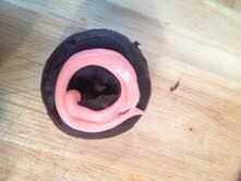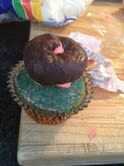 Han alcanzado la etapa donde se llega a usar mini donas. Para este paso, recomiendo usar la Manga pastelera, pero se puede también usar la técnica de hielo sucio. Tome un mini donas y pipa o un círculo alrededor de la parte inferior del hielo. Hacer esto con todos 12 donas y luego pop esos mamones justo en la parte superior de la Magdalena. Se pueden descansar sus magdalenas con las donas durante unos 15 minutos en el congelador si desea, para asegurarse de que se pega, pero no es un requisito.