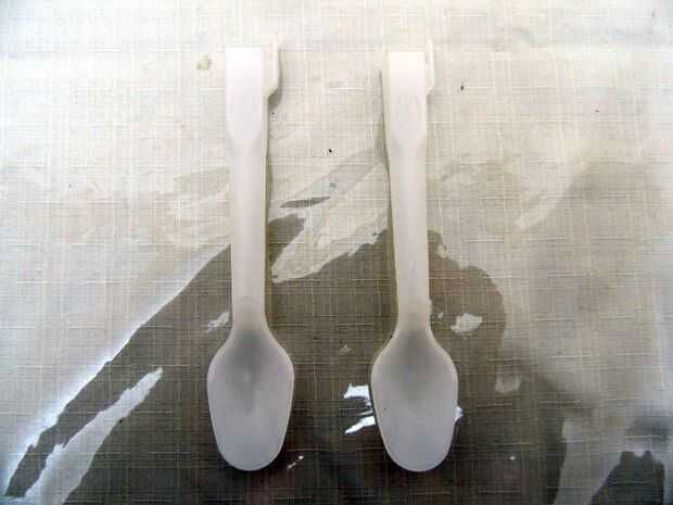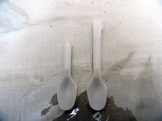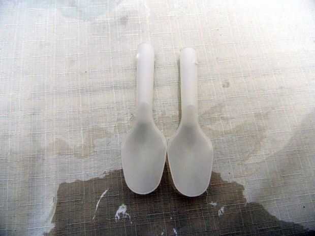 Tomar las dos cucharas de McFlurry y cortarlas según de cuánto tiempo usted desea los brazos (cortar más de menos en medio de la manija). Perfore un agujero en el extremo de cada cuchara y sujete a los hombros.