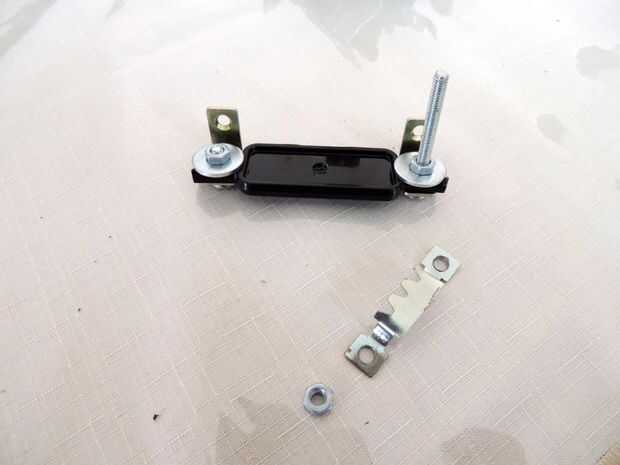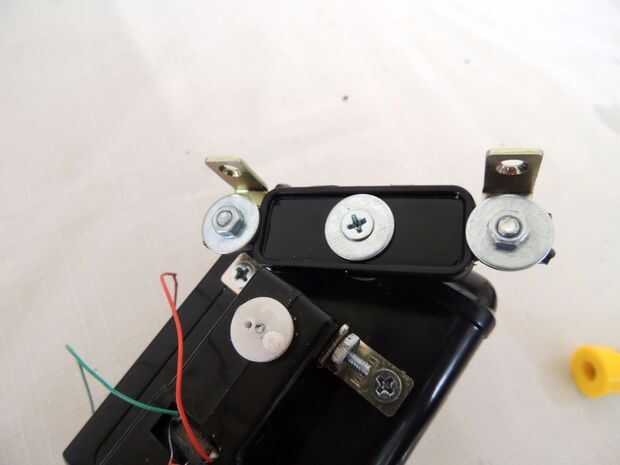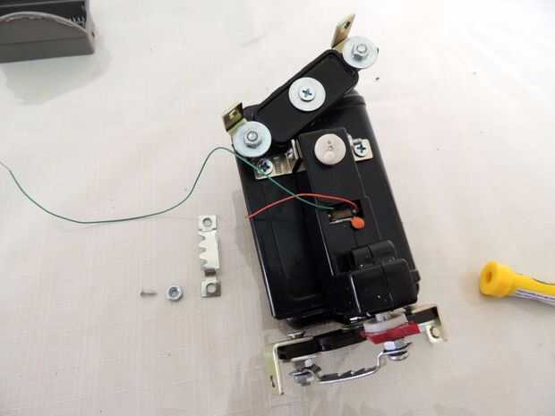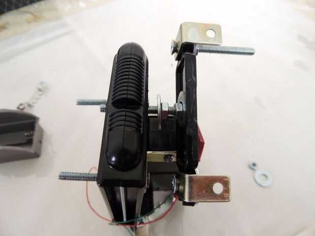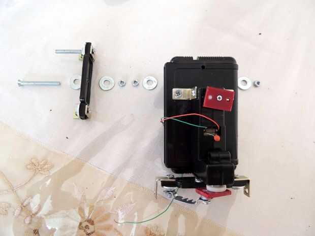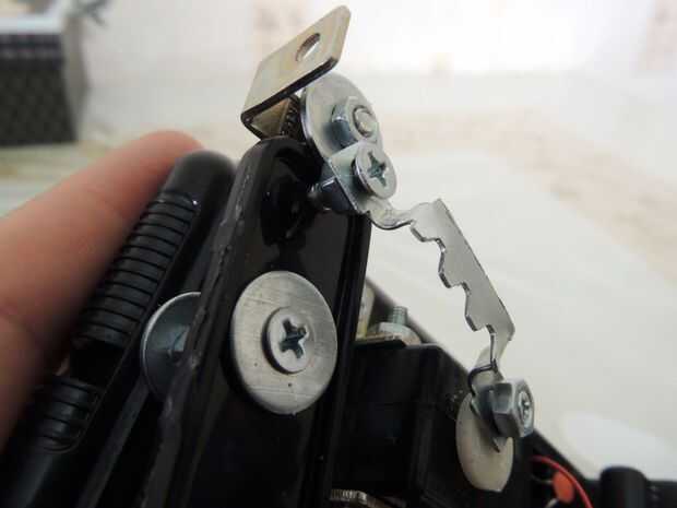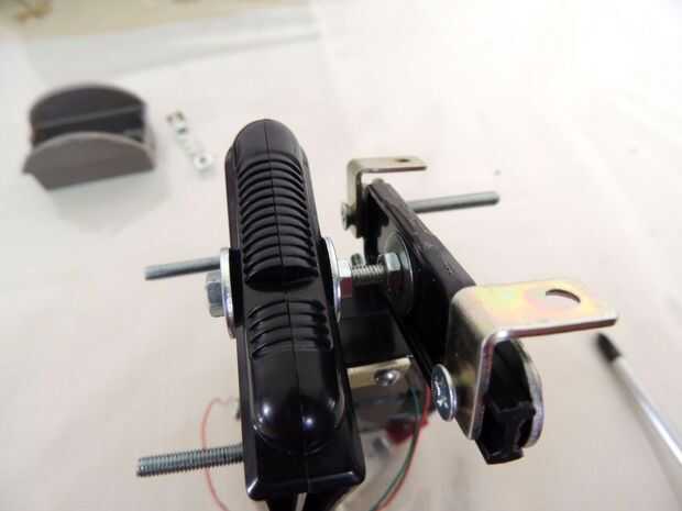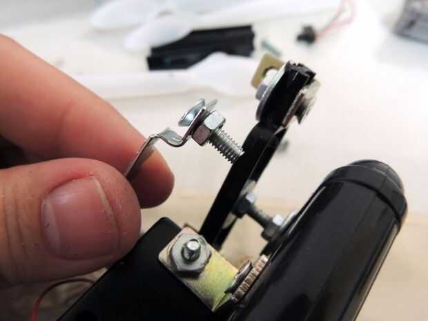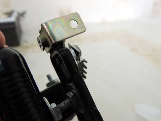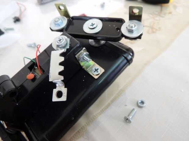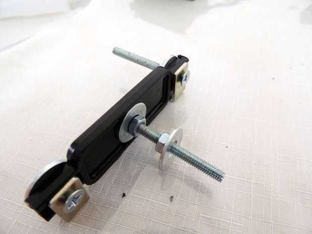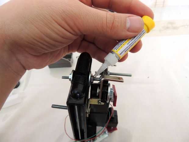 Ahora tienes que crear el mecanismo de los hombros, en forma similar a los dos pasos anteriores. La diferencia será esta vez, no inserte el eje en un ángulo de hierro, sino directamente al cartucho de juego. Recuerde: el tornillo tiene que estar firmemente sujetas al cartucho, pero la pieza de la percha y el mecanismo tienen que ser un poco flojo para permitir el movimiento.