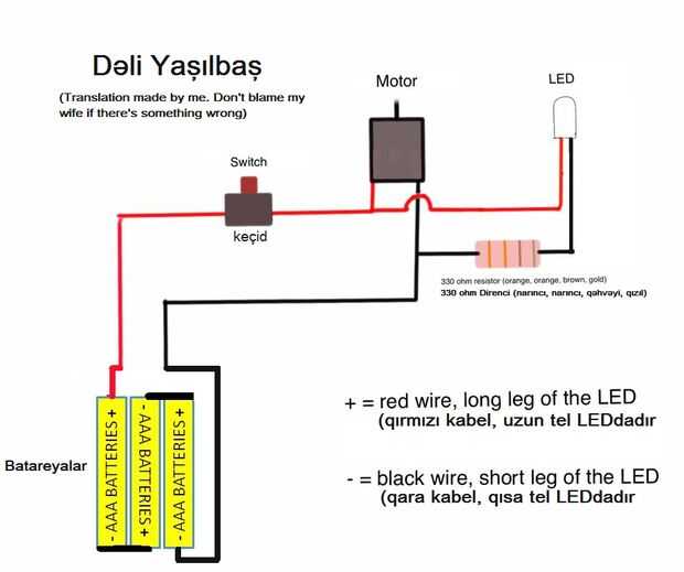 La parte eléctrica de este proyecto es muy sencilla: sólo tienes que seguir este esquema. Para evitar confusiones, el cable que viene desde el polo positivo de las baterías es de color rojo; y la negativa, negra.
