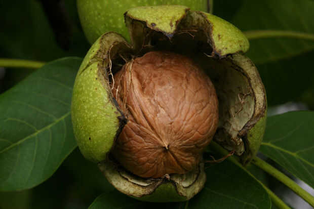 Las hojas verdes son las cáscaras verdes alrededor de las nueces. El mejor momento para obtener las hojas verdes es en septiembre. Entonces las hojas se arrugan, da vuelta a negras y caen del árbol. Después de recogerlas, se debe secar separándose en una hoja y ponerla en la estufa.
