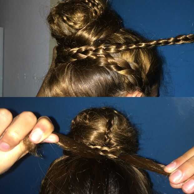 Neem het overtollige haar en draai het rond de punto. Maak het haar gran schuifspeldjes met. Neem vervolgens de twee vlechten aan de zijkant van je hoofd die overblijven. Kruis deze vlechten onder je punto en maak ze gran met schuifspeldjes (zie afbeelding).
