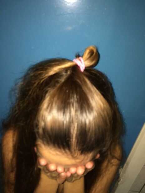 Borstel je haar naar achteren, zodat er geen scheiding meer zichtbaar es. BIND dit haar gran met een rekkertje.