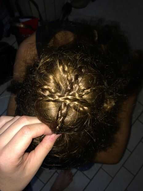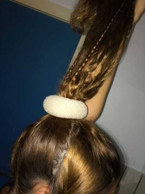 Neem je donutrekker erbij. Steek je haar puerta de donutrekker. Neem je haar strak vasta en laat nu je staart vallen zodat je haar de completa dona bedekt. Neem nu een grote rekker en plaats rond de punto de dobladillo. Verspreid de vlechtjes zodat ze goed zichtbaar zijn (zie afbeelding).