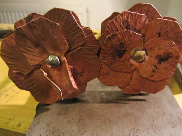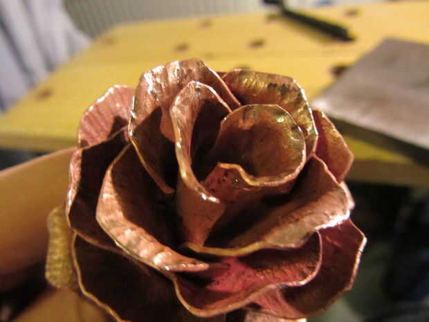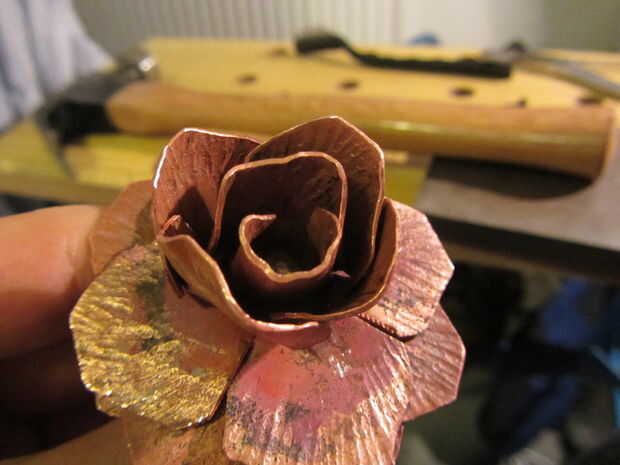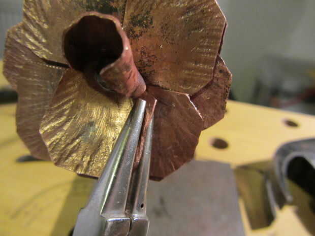 Comenzar tomando el rectángulo y doblar uno de los pétalos hacia arriba y alrededor del remache. Puede ser muy útil empezar en la parte del pétalo que está más cercano a la madre y trabajo hacia el exterior - que se aplica de esta forma. Si en cualquier momento el metal se convierte en inviable, deténgase - usted no puede obligar. Simplemente templar esa sección del cobre (por uso táctico de un soplete, por ejemplo) y seguir adelante. Realmente no quieres romper un pétalo ahora.