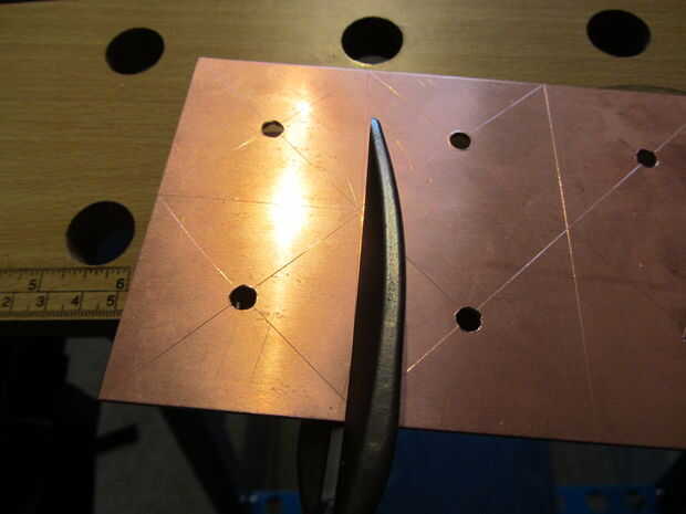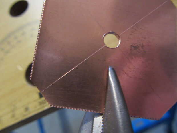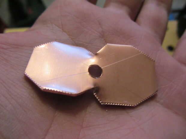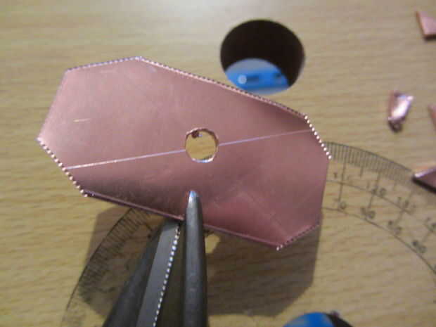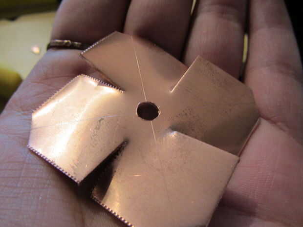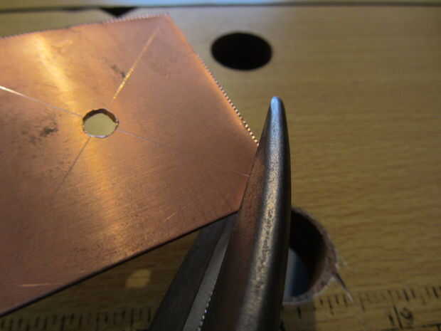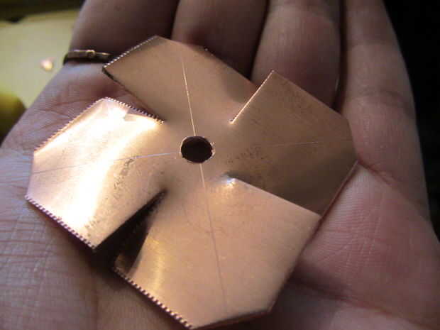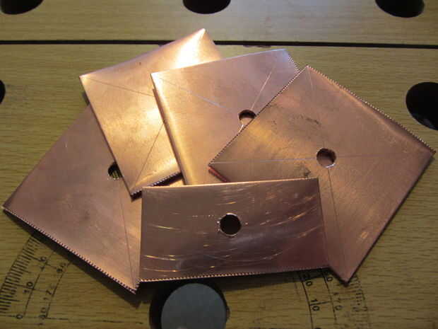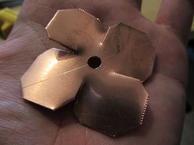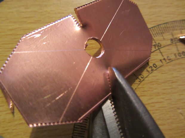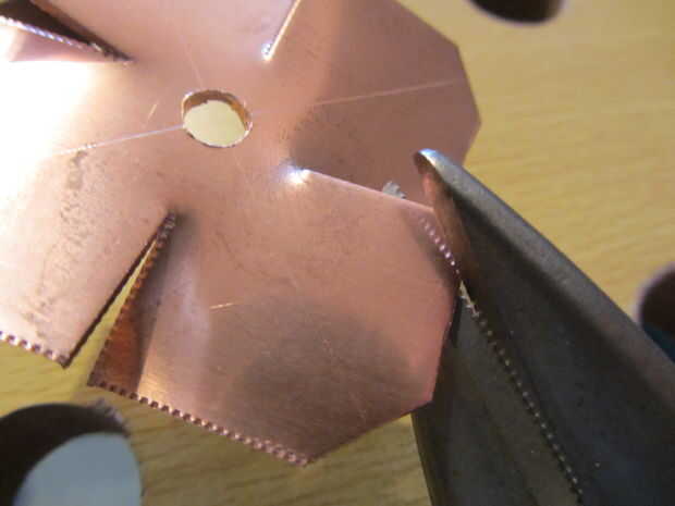 Para piezas cuadradas, hacer cortes del centro de cada lado hacia el centro que a 5mm del agujero. Mucho más cerca y el cobre se romperán en estos puntos - menos, y va a ser duro formar los pétalos. Si usas tinsnips buena, el cobre se dobla naturalmente, así que usted consigue algo como esto: