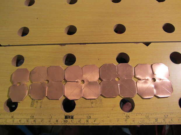 Cortar todas las esquinas de cada espacio en blanco. Desea eliminar suficiente cobre para que acaben con algo que se ve así: