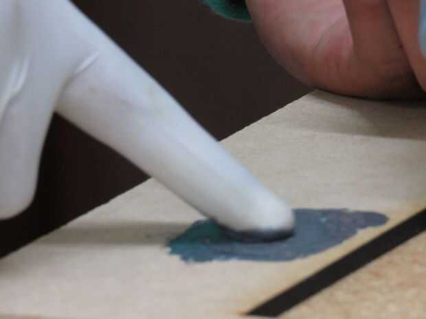 Dosificar con la jeringa de pegamento epóxico cantidades iguales de resina y catalizador. Con un guante de látex, mezclar con el dedo, durante un minuto ambas sustancias hasta el color de esta mezcla sea uniforme.