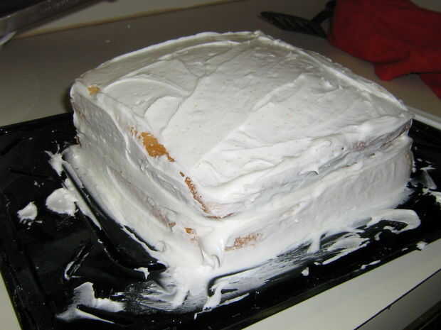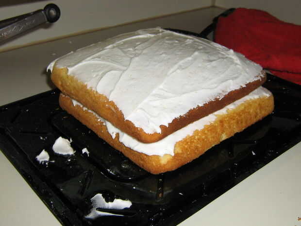 Helada de la parte superior de las dos tortas y capa encima de la otra. Bastante fácil, ¿verdad? Lo pensé demasiado.