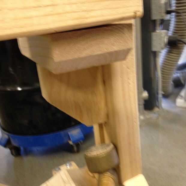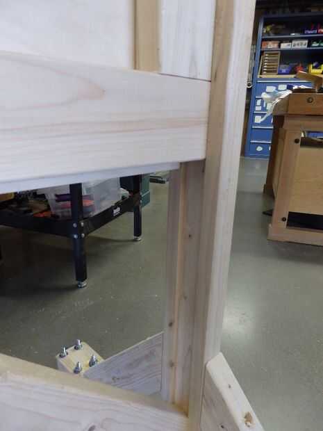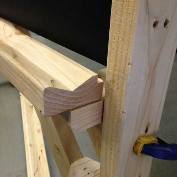 Se puede ver cómo encajan las piezas del marco en las columnas aquí. La bandeja de la pizarra era cortar con la Sierra de mesa con la hoja ~ 15 grados y el 2 x 4 en borde entonces movido de un tirón. Prueba corta primero para obtener los cortes para cumplir. La última foto es uno de los soportes de la bandeja que se desliza en el riel lateral.