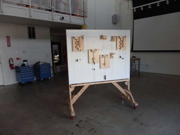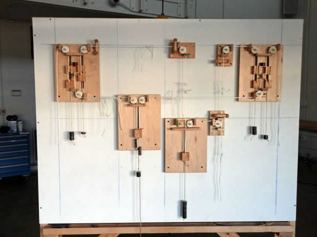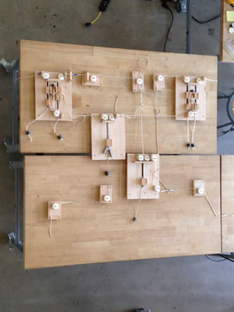 pero necesito probar el equipo. Hice un acuerdo de las partes en un par de mesas de trabajo, hizo un tablero blanco (capas de 1/2"~ 4' x 5') para poner y proteger la pizarra en un lado. Utiliza un chalkline para hacer la maqueta en mi "tablero blanco" después de mis dimensiones montadas las piezas de la computadora, funcionó la cadena y atados a todos los componentes. Y para mi sorpresa, funciono bastante bien la primera vez. A pocas horas de malabares pesos para obtener los componentes en equilibrio y...