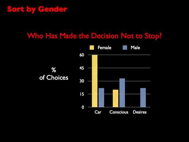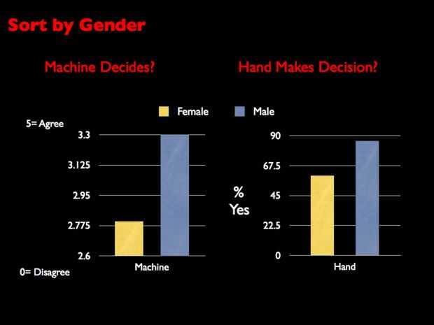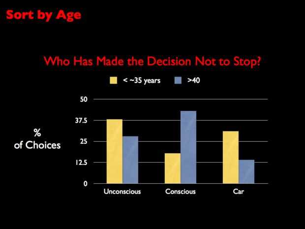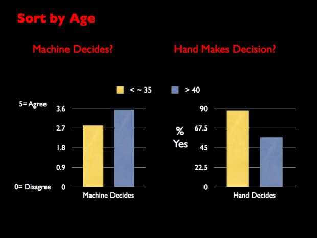 El promedio de edad de los encuestados era ~ 32 y el grupo más joven era que menos propensos a pensar que la máquina decida. O tal vez solo menos en duda. También el grupo más joven piensa el inconsciente o el coche tomado la decisión. El Grupo estimó la mente consciente. Las hembras pensaban el coche era el culpable más probable y también eran menos propensos a pensar que la máquina decida.