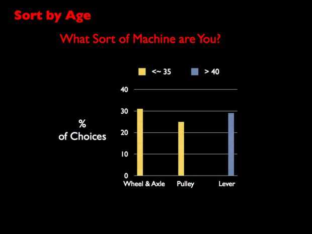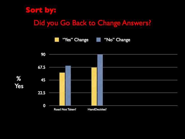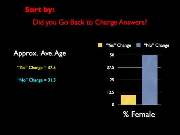 Un análisis preliminar de algunas de las respuestas mostraron algunas cosas especialmente ordenadas por edad, género y si volvieron a cambiar respuestas interesantes. Más resultados serán próximamente pero no estoy seguro de dónde publicar.