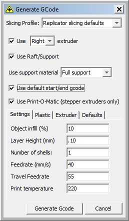 Estos son los ajustes que utilizo para los modelos que quiero ser bastante detallado. Muchas personas hablan sobre los beneficios de la impresión raftless, pero creo que ayuda de balsas el plástico se adhiere mejor y puede conseguir mucho mejor impresiones como resultado. Material de apoyo sólo es necesario si hay graves desplomes en el modelo (como el arco de motor superior de la nave espacial).