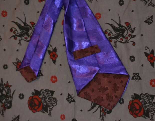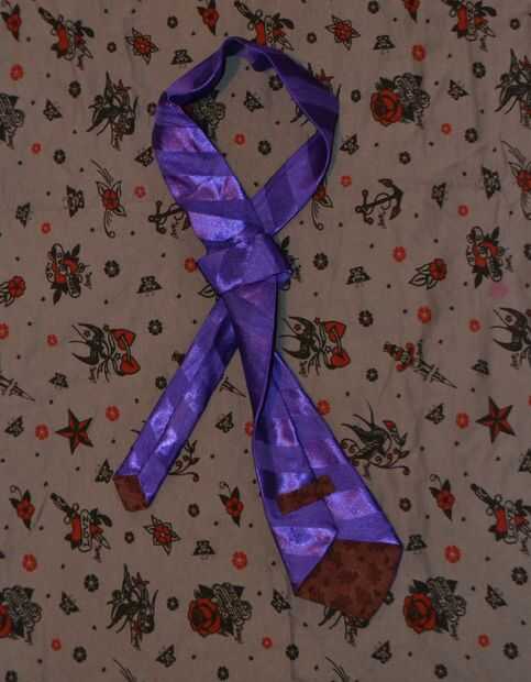 Modding 2 corbatas convencionales en una reversible retro-ascot.Es necesario:-Dos corbatas convencionales de ancho suficiente y casi el mismo ancho.-Máquina de coser, destripador de la costura, plancha, tijeras de tela, juego de hilos, alfileres, agu