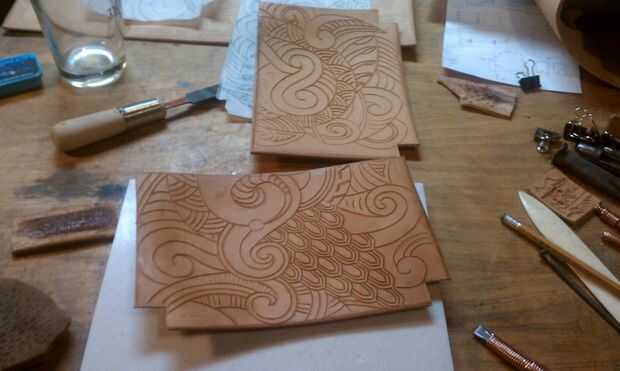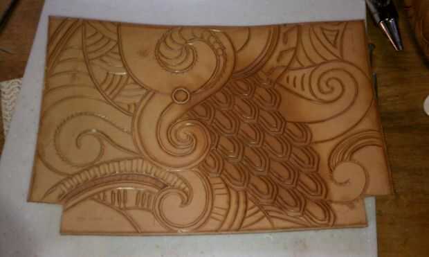 - Continuar tallando el diseño en humedecer el cuero como vas. Tenga cuidado en los bordes, es fácil para el cuchillo del eslabón giratorio saltar los bordes.