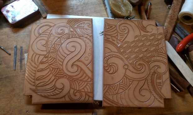 Hacerlo del mismo modo que el plegamiento de los lados de la tapa. Con la talla en el exterior que tendrá que tener cuidado para no mar el diseño mientras se trabaja el cuero doblado. Trate de usar la cantidad mínima de agua necesaria para obtener el cuero para mover, mucha agua elevará el biselado.