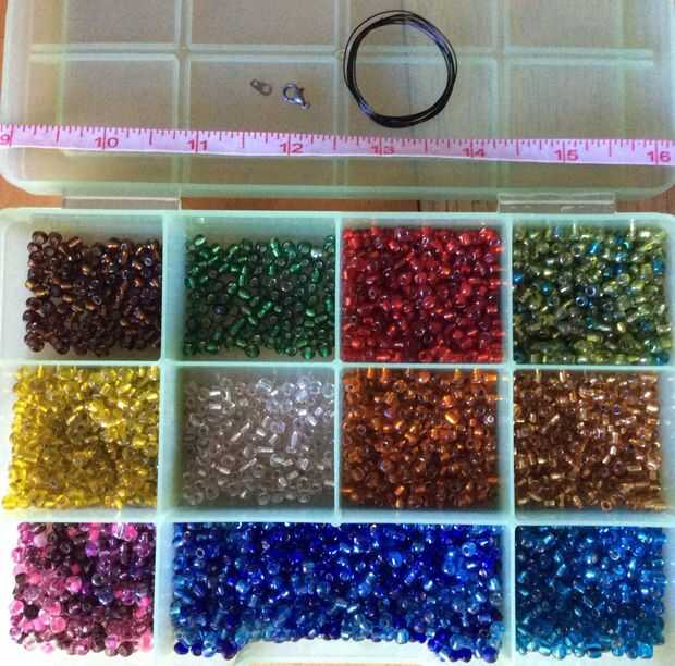 Todo lo que necesitas es: un broche, 35" de alambre de la joyería de calibre 28 y aproximadamente 70 granos pequeños.