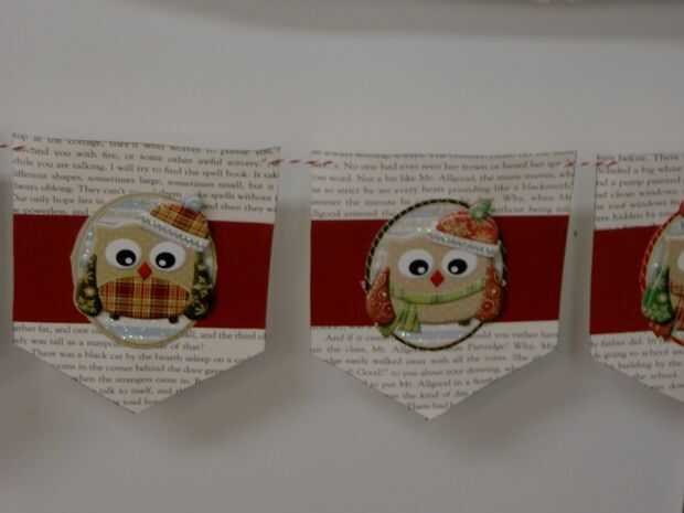 La Fundación de la bandera se hace de un libro desechado. Yo recorte los banderines en las páginas de había añadido una tira roja en el centro y había asegurado los buhos.