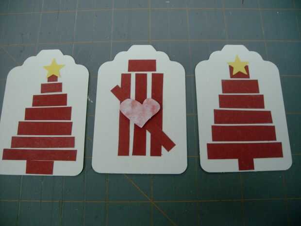 He podido crear tres etiquetas de regalo con los trozos de tira roja. Dos etiquetas tenían árboles abstractos y uno un resumen de la barra imagen.