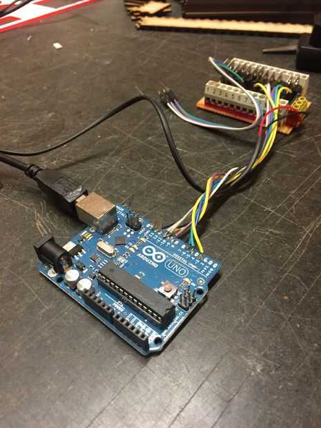 Conectar los cables a la Arduino y los soldados para que no tener que preocuparse de ellos haber sido desconectado. Como se puede ver tienen más conexiones en la placa de Arduino puede manejar. Esto es porque al principio pensamos en utilizar dos Arduinos ejecutando el mismo programa.