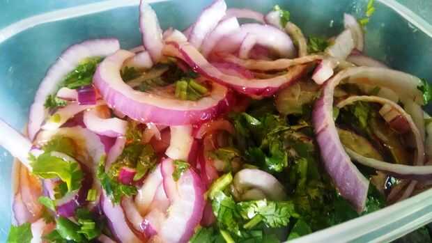 En primer lugar preparar las cebollas rojas en vinagre. Comenzar mezclando partes iguales de rojo de vinagre de vino y aceite de oliva en un recipiente. Siguiente fino rebanada cebolla y picar el cilantro, añadir a la mezcla. Ahora toma miel y asegúrese de agregar suficiente para cubrir todas las cebollas. Agregue sal y pimienta, tapa y refrigera por al menos una hora.