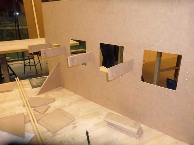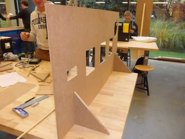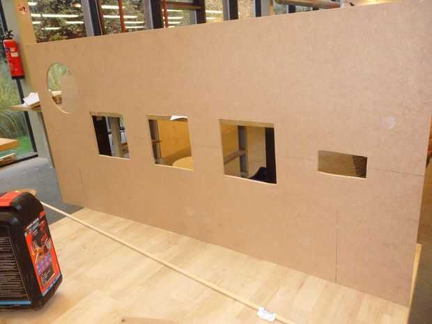 Empezamos con un tablero del MDF de 120 a 60 cm. fuera de este foro hemos cortado 1 círculo con un diámetro de aproximadamente 24 cm, 3 cuadrados de 25 a 25 cm y un pequeño rectángulo de 10 a 5 cm.