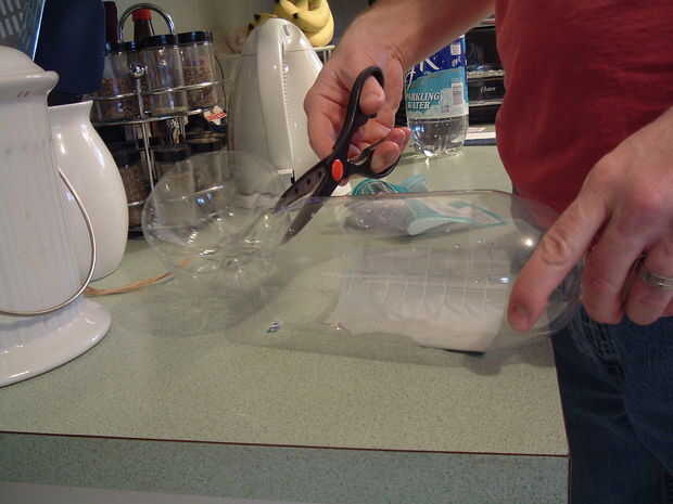 Con unas tijeras, cortar la parte inferior de una botella completamente apagado. En mi caso usé un 2 litros. Guardar piezas superior e inferior.