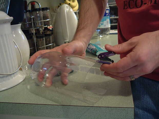 Utilizar una perforadora de papel para hacer un agujero para la ventosa cerca del borde de la botella cortada.