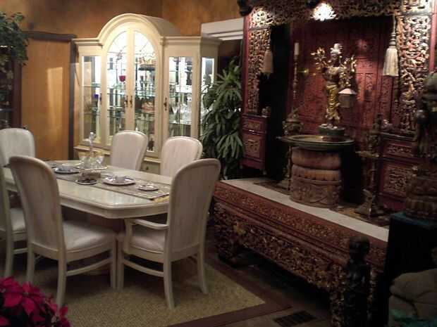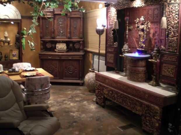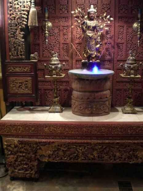 Optando por privacidad de que decidí tomar estas piezas antiguas tallado frentes de cama China que tenía junto a una estatua que compré, venta de garage de algunos hallazgos y mezclado con algunos otros artículos que tenía y ha añadido algo de madera, una pantalla de $10,00 para la espalda, algunos azulejos de piso grande de 20", una bandeja de mesa de bronce y algunas ruedas de muebles/carro grande para fácil movilidad.