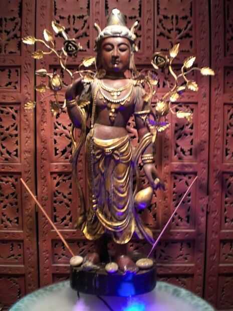 El centro se compone de dos soportes de madera apilados uno encima del otro con un tazón de cerámica grande con un nebulizador colocado en el centro para un agradable efecto misterioso. Cuando no estoy usando el tazón de fuente grande con agua, la cubro con una bandeja de mesa de bronce de la India.