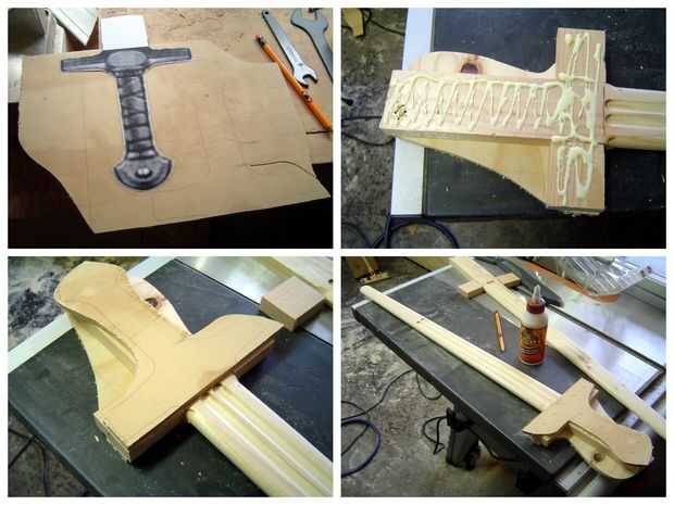 Sorteo una empuñadura, pomo + empuñadura de diseño en un pedazo de madera contrachapada con la ayuda de una plantilla. Dos con la sierra caladora cortar - más o menos está bien, puede estar fuera de las líneas en esta etapa. Ahora, dos recortes de madera y pegar todas las cinco piezas como se muestra en la imagen. Yo les viró todo junto con una pistola de clavos. Una vez seco, cortar el patrón con mucho cuidado y recorrer todo con el router nuevo. También perforó un agujero en el pomo y había enrutado, demasiado.