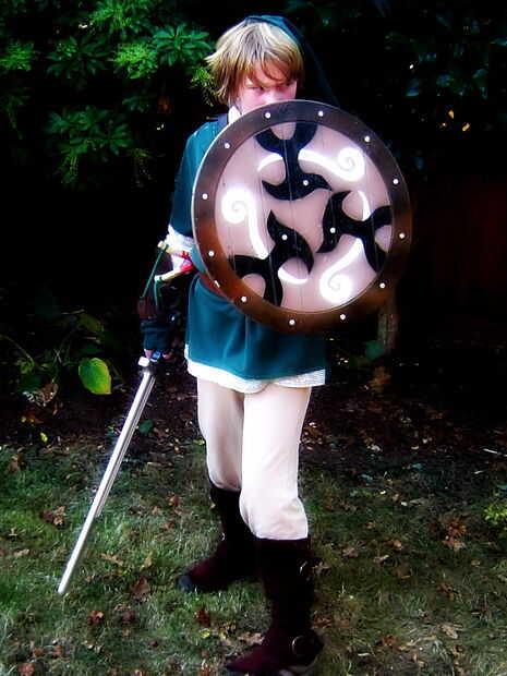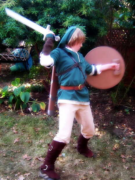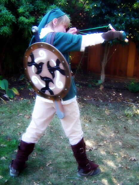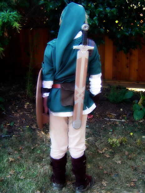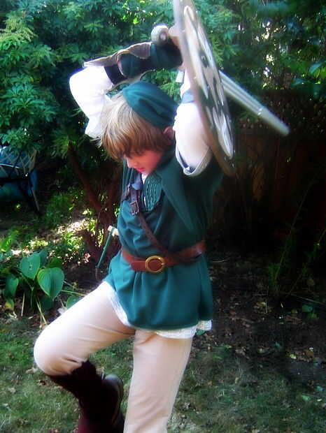 Enlace lleva una túnica verde con cota de malla debajo, un gorro verde flojo, varios cinturones y bolsas y botas de cuero. La ropa, cinturones y botas vinieron sobre todo de tiendas de segunda mano por unos pocos dólares. Las túnicas con el correo en las fotos fueron cosidas por mi madre, que le encanta hacer cosas para sus nietos. Ella hizo un gran trabajo, y los muchachos son amped sobre Link-ing para Halloween. Montar todos juntos y dejar Link ir a salvar a la princesa (o al menos recoger algunos dulces).