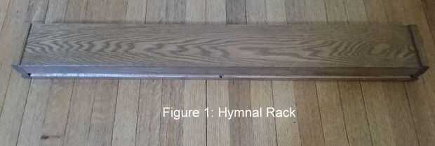 Al acercarse el día de su salida, él encontró que tenía montones de estos bastidores himnario amontonados en su taller. Desde que supe que estoy un poco de un carpintero aficionado preguntó si estaría interesado en ellos. Pregunta tonta! Eran bien acabado roble (creo) y al mismo tiempo un poco polvoriento, el acabado fue en maravillosa condiciones (Figura 1). Así que hicimos la transición de su taller a la mía.