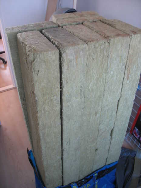 16 x 100x30x10cm losas de lana de roca pesada (10€, tomé esto como las sobras de algunos proyectos de aislamiento de garaje, asegúrese de conseguir la materia pesada, más peso por m3 el mejor. Puede reemplazar esto por lana de vidrio u otro material de aislamiento que son generalmente más baratos, pero esto fue lo mejor que pude conseguir para el precio).