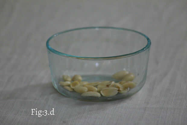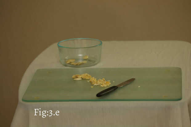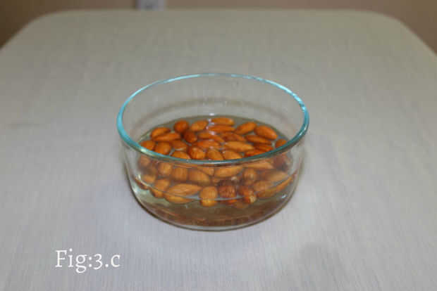 2. Remoje las almendras en 1/2 taza de agua durante 1 hora. Luego retire la piel y picar en trozos pequeños. Ver Fig:3.c, Fig:3.d y Fig:3.e