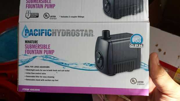 -bomba sumergible ($9,00): usted puede encontrarlas en su ferretería local. Fui al puerto de carga y tenían unos cuantos para elegir! versión de Figjam utiliza bombas aproximadamente 42 galones por hora y una bomba solar que es de 12 voltios. Me encantó la idea de lo que tiene ser completamente solar, pero cuando trataba de sacarla, no había tanto poder ir a través de él, y si hay alguna sobre el elenco, no funcionará en absoluto. y por 20 dólares no pensé que valía la pena it.so que opté por que puedo conectar en que tenía 120 voltios.