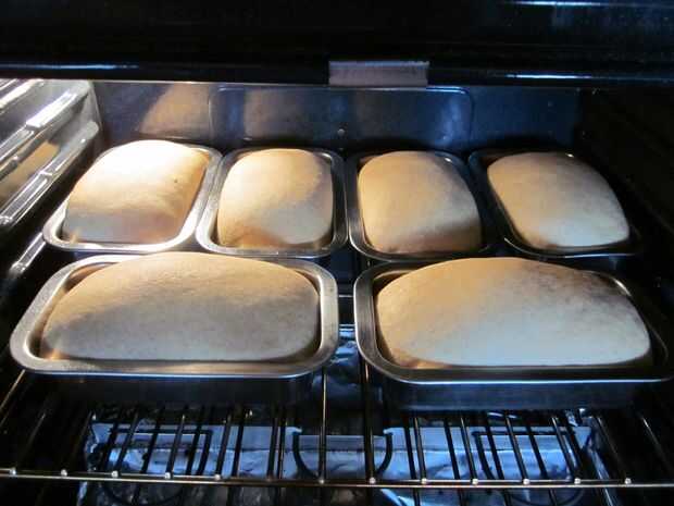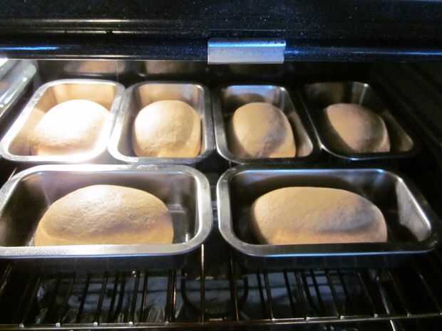 Subida y hornear: quisiera dejar mi pan aumento en un horno calentado ya que crea un entorno consistente para el pan a, independientemente de la temperatura de tu cocina. No necesita preocuparse o especular en tiempo de levantamiento. Precalentar el horno a 200 grados. Deslice las bandejas de pan en y apague el horno (no te preocupes escapar calor como se abre el horno - que es una buena cosa). Ajuste el temporizador durante 30 minutos. Después de 30 minutos, el pan debe doblado o aumentado por lo menos a una pulgada sobre el borde de la cacerola. No abra la puerta del horno o sacar el pan. Simplemente precaliente su horno a 350 grados y ajuste el temporizador durante 30 minutos más. Después de 30 minutos, abrir la puerta y comprobar el pan. Las tapas deben ser de color marrón dorado, crujiente. Retire inmediatamente los panes de los moldes para evitar sogginess. Encuentra el pan en un alambre parrilla se enfríe completamente, que tarda varias horas.