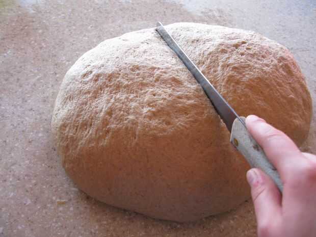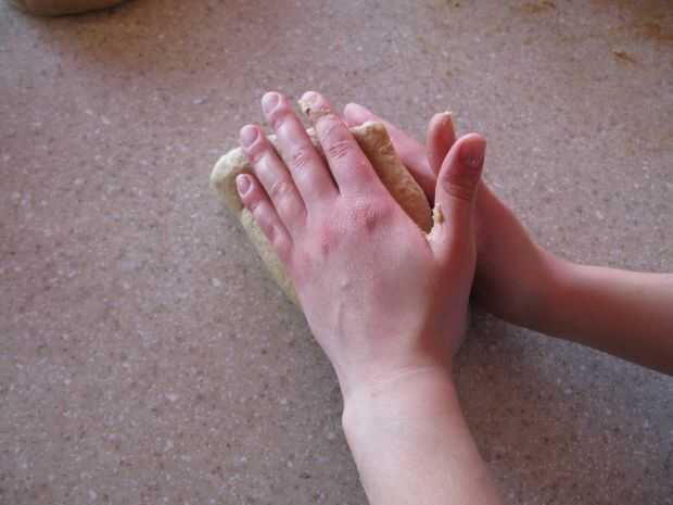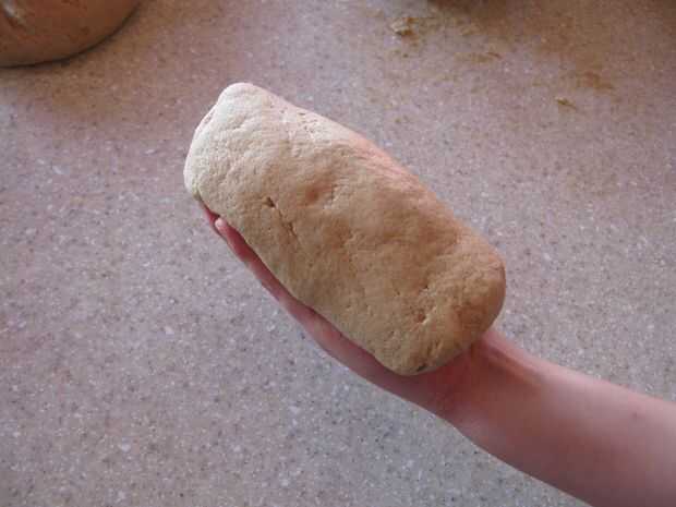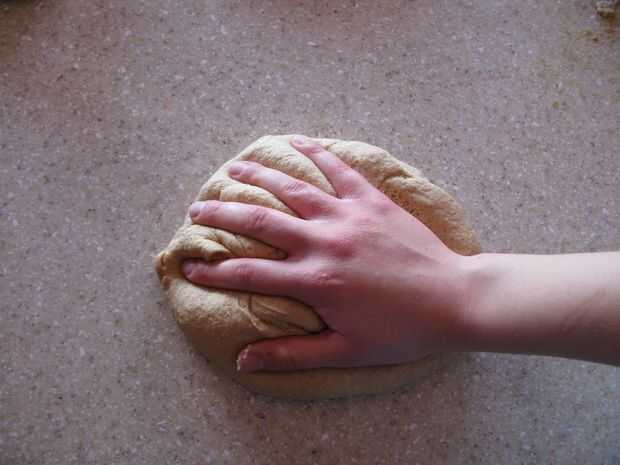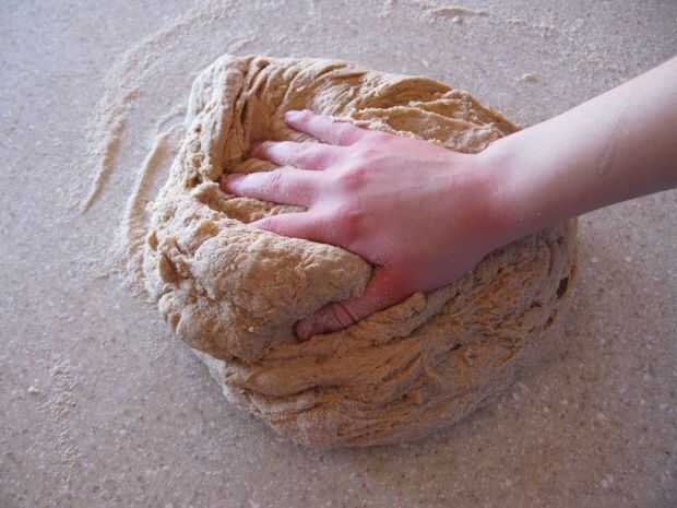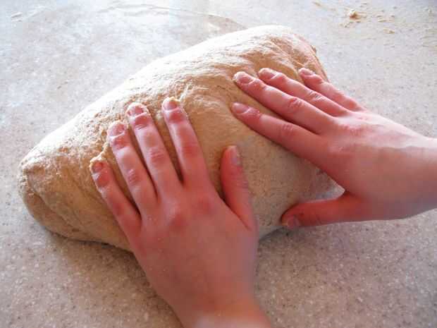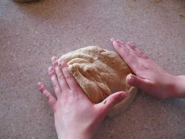 Amasar: este paso es sencillo. Con las manos bien engrasadas y contador, introduzca ambas manos en la masa. Dar un cuarto de vuelta doblando la masa sobre por la mitad. Empuje hacia adelante otra vez. Repetir este movimiento 10-15 minutos, hasta que la masa se aclara y es suave y flexible. Usted notará un cambio en la textura de la masa como se desarrolla el gluten y homogeneiza la masa. La pasta debe ser pegajoso y flexible y no se pegue a las manos.