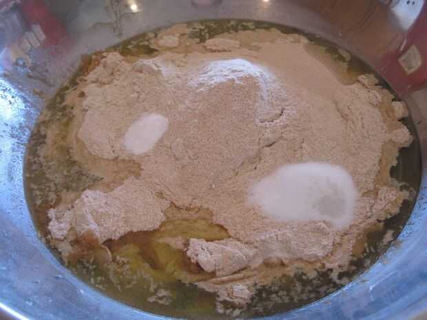 Mezcla: mientras tanto, poner el agua, la miel y el aceite en un tazón grande. Yo uso una taza de medir 1 taza para medir y verter el aceite, luego llenarlo 3/4 completo con miel y agregarlo así. La superficie aceitosa de la Copa hace que la miel a derramar derecha sin dejándote con un lío pegajoso! Siguiente descarga en una tolva completa de harina (aproximadamente 9-10 tazas). Mida y añada de su levadura, sal, gluten y vitamina C en polvo. Mezcle bien. Moler una tolva adicional de harina. Añadir harina (5 tazas), una taza a la vez, hasta que la masa se forma y se convierte en difícil de remover. Enrolle la masa en una bola, raspando los bordes del tazón de fuente y resultan en una superficie muy enharinada. Seguir trabajando (2-3 tazas) de harina con las manos hasta que la masa es pegajosa y todavía húmeda pero no pegajosa. Aceite de tu contador y sus manos para comenzar el proceso de amasado.