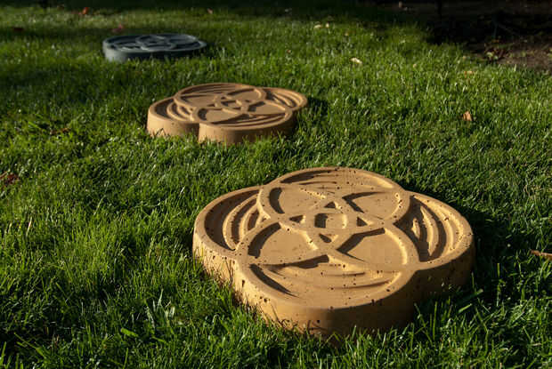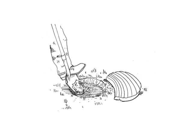 • Para plantar en el suelo, coloque la piedra donde usted lo desee y espolvorear harina a lo largo de la frontera para marcar el lugar. Cave un hoyo 3-4" de profundidad y rellenar con 2" de arena. Colocar la piedra angular en el agujero y roca ida y vuelta hasta que esté completamente asentado.