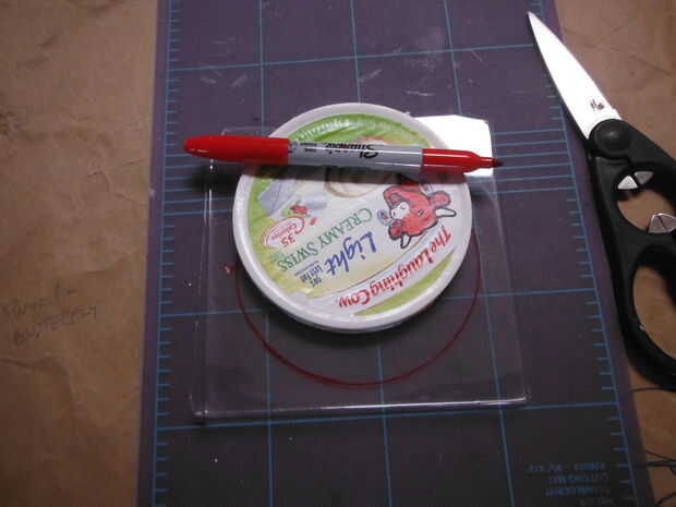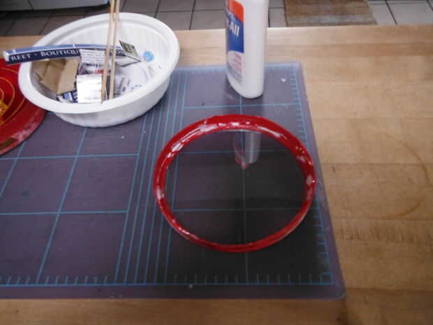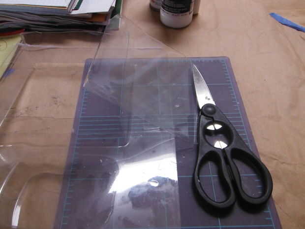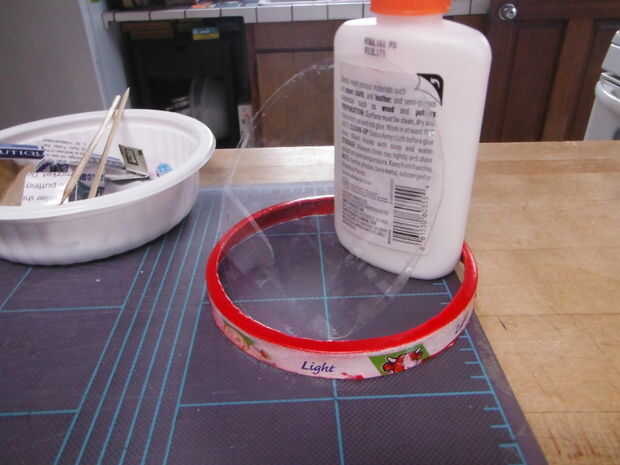 Para terminar la parte superior, que necesitaba para cortar un trozo de plástico para caber dentro.  Después de recortar el exceso, dibujaba en la parte superior de la caja en el plástico y cortar un círculo dentro de la línea.  Entonces (después de la limpieza) pegado el plástico dentro de la tapa.